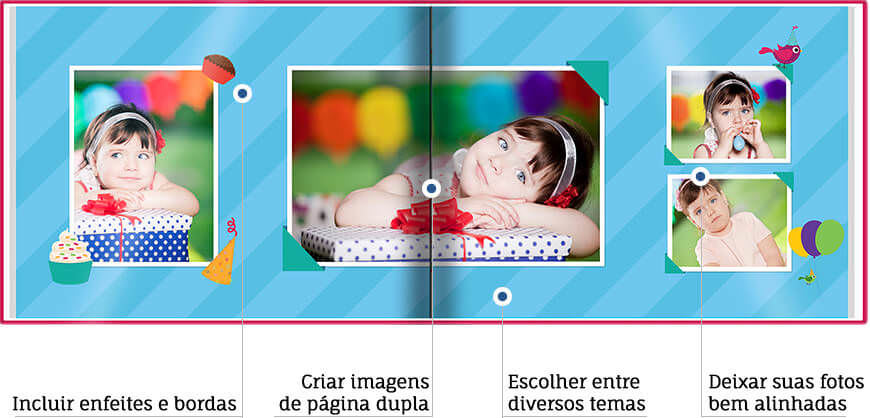 O D-Book® oferece diversas opções de bordas, enfeites e fundos para você colocar onde preferir. Com ele, você também tem a liberdade de criar e inserir textos nos layouts.